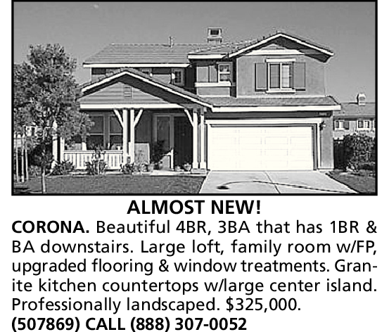 CORONA. Beautiful 4BR, 3BA that has 1BR & BA downstairs. Large loft, family room w/FP, upgraded flooring & window treatments. Granite kitchen countertops w/large center island.