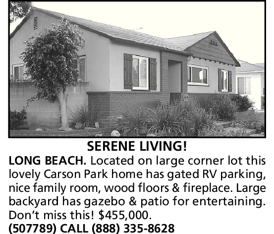 SERENE LIVING! LONG BEACH. Located on large corner lot this lovely Carson Park home has gated RV parking, nice family room, wood floors & fireplace. Large backyard has gazebo & patio for entertaining. Don’t miss this! $455,000. (507789) CALL (888) 335-8628
