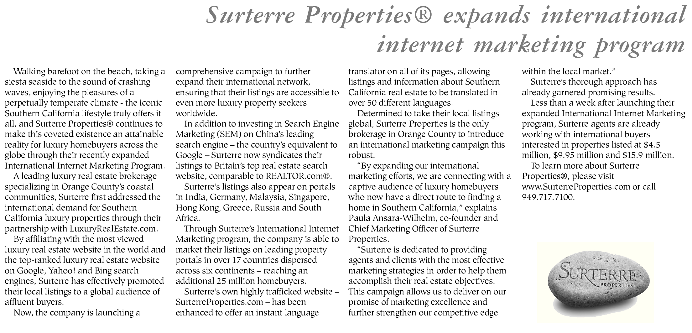 Determined to take their local listings global, Surterre Properties is the only brokerage in Orange County to introduce an international marketing campaign this robust.