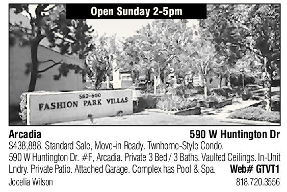 Open Sunday 2-5pm Arcadia 590 W Huntington Dr $438,888. Standard Sale, Move-in Ready. Twnhome-Style Condo. 590 W Huntington Dr. #F, Arcadia. Private 3 Bed / 3 Baths. Vaulted Ceilings. In-Unit Lndry. Private Patio. Attached Garage. Complex has Pool & Spa. Web# GTVT1 Jocelia Wilson 818.720.3556 See also