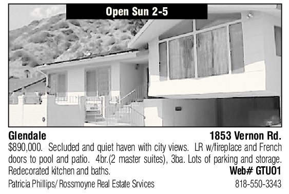 Open Sun 2-5 Glendale 1853 Vernon Rd. $890,000. Secluded and quiet haven with city views. LR w/fireplace and French doors to pool and patio. 4br.(2 master suites), 3ba. Lots of parking and storage. Redecorated kitchen and baths. Web# GTUO1 Patricia Phillips/ Rossmoyne Real Estate Srvices 818-550-3343