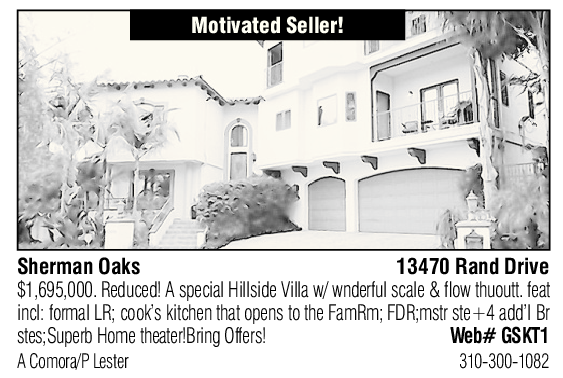 Motivated Seller! Sherman Oaks 13470 Rand Drive $1,695,000. Reduced! A special Hillside Villa w/ wnderful scale & flow thuoutt. feat incl: formal LR; cook’s kitchen that opens to the FamRm; FDR;mstr ste+4 add’l Br stes;Superb Home theater!Bring Offers! Web# GSKT1 A Comora/P Lester 310-300-1082