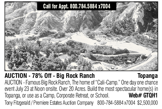 Call for Appt. 800.784.5884 x7004 AUCTION - 78% Off - Big Rock Ranch Topanga AUCTION - Famous Big Rock Ranch, The home of “Cali-Camp.” One day one chance event July 23 at Noon onsite. Over 20 Acres. Build the most spectacular home(s) in Topanga, or use as a Camp, Corporate Retreat, or School. Web# GTQH1 Tony Fitzgerald / Premiere Estates Auction Company 800-784-5884 x7004 $2,500,000