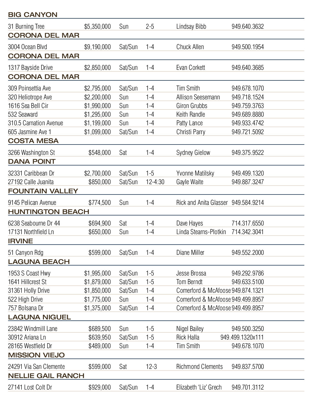 309 Poinsettia Ave $2,795,000 Sat/Sun 1-4 Tim Smith 949.678.1070 320 Heliotrope Ave $2,200,000 Sun 1-4 Allison Seesemann 949.718.1524 1616 Sea Bell Cir $1,990,000 Sun 1-4 Giron Grubbs 949.759.3763 532 Seaward $1,295,000 Sun 1-4 Keith Randle 949.689.8880 310.5 Carnation Avenue $1,199,000 Sun 1-4 Patty Lance 949.933.4742 605 Jasmine Ave 1 $1,099,000 Sat/Sun 1-4 Christi Parry 949.721.5092 COSTA MESA 3266 Washington St $548,000 Sat 1-4 Sydney Gielow 949.375.9522 DANA POINT 32331 Caribbean Dr $2,700,000 Sat/Sun 1-5 Yvonne Matilsky 949.499.1320 27192 Calle Juanita $850,000 Sat/Sun 12-4:30 Gayle Waite 949.887.3247 FOUNTAIN VALLEY 9145 Pelican Avenue $774,500 Sun 1-4 Rick and Anita Glasser 949.584.9214 HUNTINGTON BEACH 6238 Seabourne Dr 44 $694,900 Sat 1-4 Dave Hayes 714.317.6550 17131 Northfield Ln $650,000 Sun 1-4 Linda Stearns-Plotkin 714.342.3041 IRVINE 51 Canyon Rdg $599,000 Sat/Sun 1-4 Diane Miller 949.552.2000 LAGUNA BEACH 1953 S Coast Hwy $1,995,000 Sat/Sun 1-5 Jesse Brossa 949.292.9786 1641 Hillcrest St $1,879,000 Sat/Sun 1-5 Tom Berndt 949.633.5100 31361 Holly Drive $1,850,000 Sat/Sun 1-4 Comerford & McAfoose 949.874.1321 522 High Drive $1,775,000 Sun 1-4 Comerford & McAfoose 949.499.8957 757 Bolsana Dr $1,375,000 Sat/Sun 1-4 Comerford & McAfoose 949.499.8957 LAGUNA NIGUEL 23842 Windmill Lane $689,500 Sun 1-5 Nigel Bailey 949.500.3250 30912 Ariana Ln $639,950 Sat/Sun 1-5 Rick Halla 949.499.1320x111 28165 Westfield Dr $489,000 Sun 1-4 Tim Smith 949.678.1070 MISSION VIEJO 24291 Via San Clemente $599,000 Sat 12-3 Richmond Clements 949.837.5700 NELLIE GAIL RANCH 27141 Lost Colt Dr $929,000 Sat/Sun 1-4 Elizabeth ‘Liz’ Grech 949.701.3112