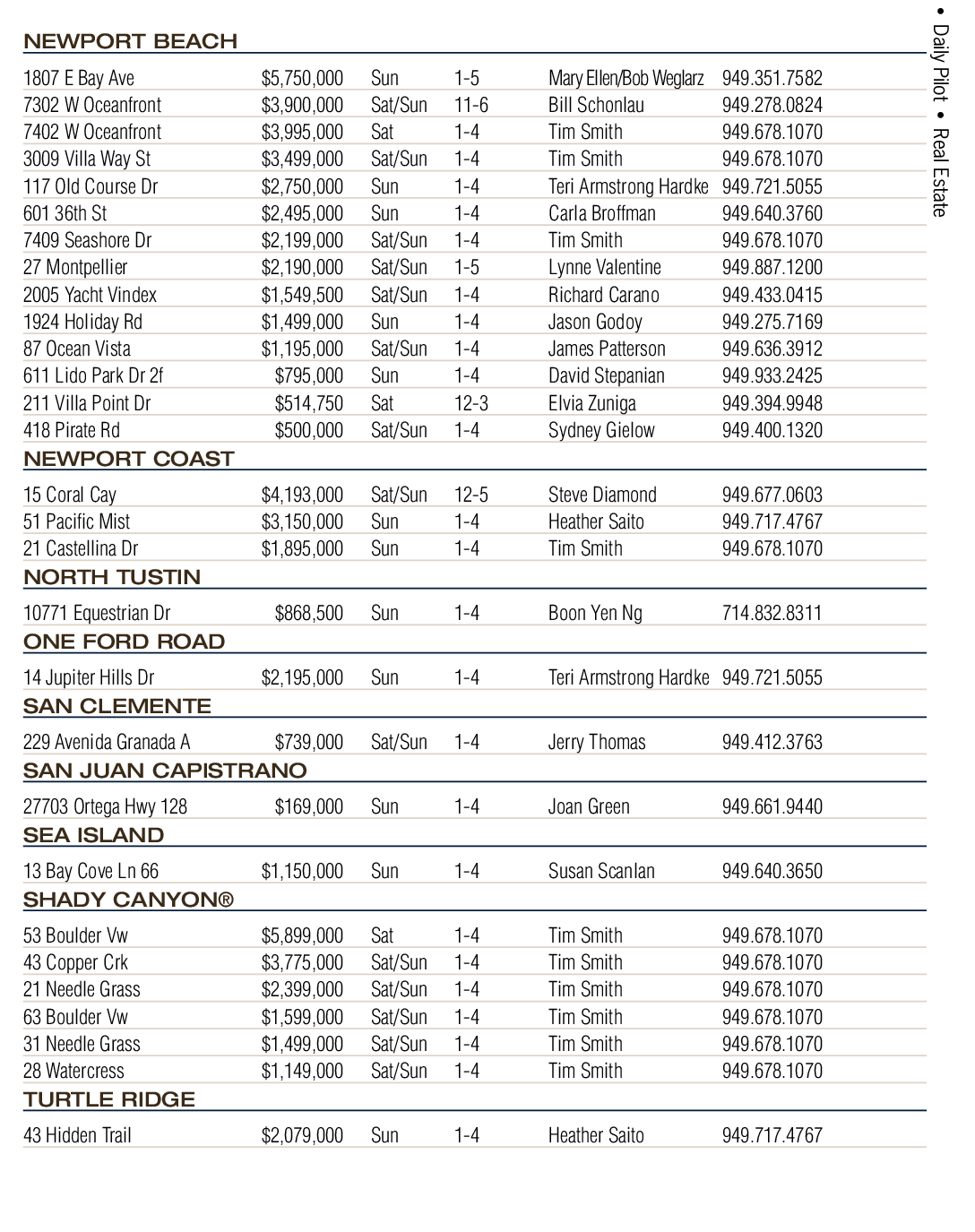 NEWPORT BEACH 1807 E Bay Ave $5,750,000 Sun 1-5 Mary Ellen/Bob Weglarz 949.351.7582 7302 W Oceanfront $3,900,000 Sat/Sun 11-6 Bill Schonlau 949.278.0824 7402 W Oceanfront $3,995,000 Sat 1-4 Tim Smith 949.678.1070 3009 Villa Way St $3,499,000 Sat/Sun 1-4 Tim Smith 949.678.1070 117 Old Course Dr $2,750,000 Sun 1-4 Teri Armstrong Hardke 949.721.5055 601 36th St $2,495,000 Sun 1-4 Carla Broffman 949.640.3760 7409 Seashore Dr $2,199,000 Sat/Sun 1-4 Tim Smith 949.678.1070 27 Montpellier $2,190,000 Sat/Sun 1-5 Lynne Valentine 949.887.1200 2005 Yacht Vindex $1,549,500 Sat/Sun 1-4 Richard Carano 949.433.0415 1924 Holiday Rd $1,499,000 Sun 1-4 Jason Godoy 949.275.7169 87 Ocean Vista $1,195,000 Sat/Sun 1-4 James Patterson 949.636.3912 611 Lido Park Dr 2f $795,000 Sun 1-4 David Stepanian 949.933.2425 211 Villa Point Dr $514,750 Sat 12-3 Elvia Zuniga 949.394.9948 418 Pirate Rd $500,000 Sat/Sun 1-4 Sydney Gielow 949.400.1320 NEWPORT COAST 15 Coral Cay $4,193,000 Sat/Sun 12-5 Steve Diamond 949.677.0603 51 Pacific Mist $3,150,000 Sun 1-4 Heather Saito 949.717.4767 21 Castellina Dr $1,895,000 Sun 1-4 Tim Smith 949.678.1070 NORTH TUSTIN 10771 Equestrian Dr $868,500 Sun 1-4 Boon Yen Ng 714.832.8311 ONE FORD ROAD 14 Jupiter Hills Dr $2,195,000 Sun 1-4 Teri Armstrong Hardke 949.721.5055 SAN CLEMENTE 229 Avenida Granada A $739,000 Sat/Sun 1-4 Jerry Thomas 949.412.3763 SAN JUAN CAPISTRANO 27703 Ortega Hwy 128 $169,000 Sun 1-4 Joan Green 949.661.9440 SEA ISLAND 13 Bay Cove Ln 66 $1,150,000 Sun 1-4 Susan Scanlan 949.640.3650 SHADY CANYON® 53 Boulder Vw $5,899,000 Sat 1-4 Tim Smith 949.678.1070 43 Copper Crk $3,775,000 Sat/Sun 1-4 Tim Smith 949.678.1070 21 Needle Grass $2,399,000 Sat/Sun 1-4 Tim Smith 949.678.1070 63 Boulder Vw $1,599,000 Sat/Sun 1-4 Tim Smith 949.678.1070 31 Needle Grass $1,499,000 Sat/Sun 1-4 Tim Smith 949.678.1070 28 Watercress $1,149,000 Sat/Sun 1-4 Tim Smith 949.678.1070 TURTLE RIDGE 43 Hidden Trail $2,079,000 Sun 1-4 Heather Saito 949.717.4767