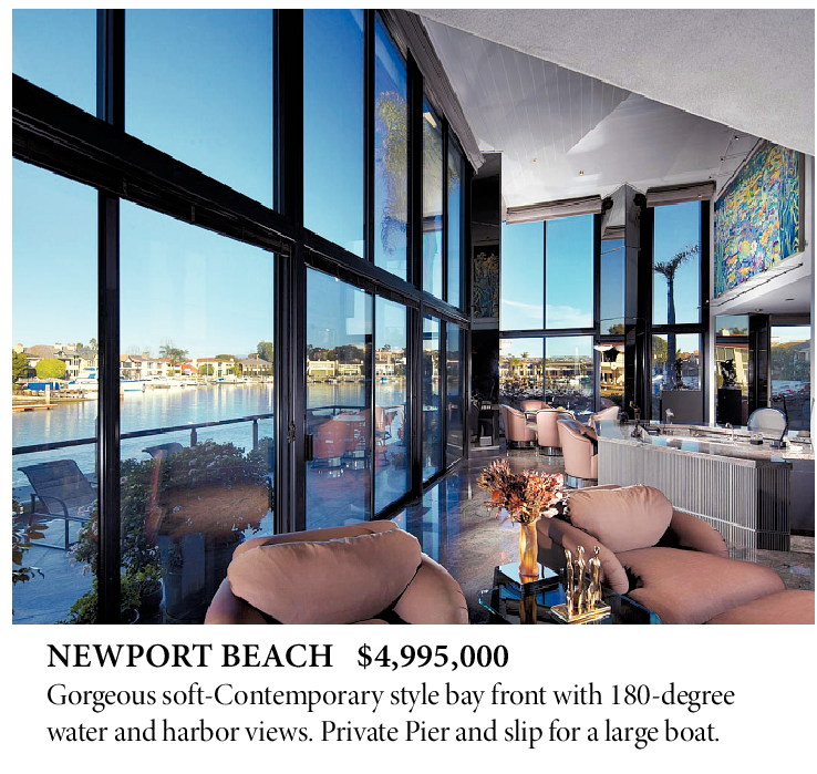 NEWPORT BEACH $4,995,000 Gorgeous soft-Contemporary style bay front with 180-degree water and harbor views. Private Pier and slip for a large boat.