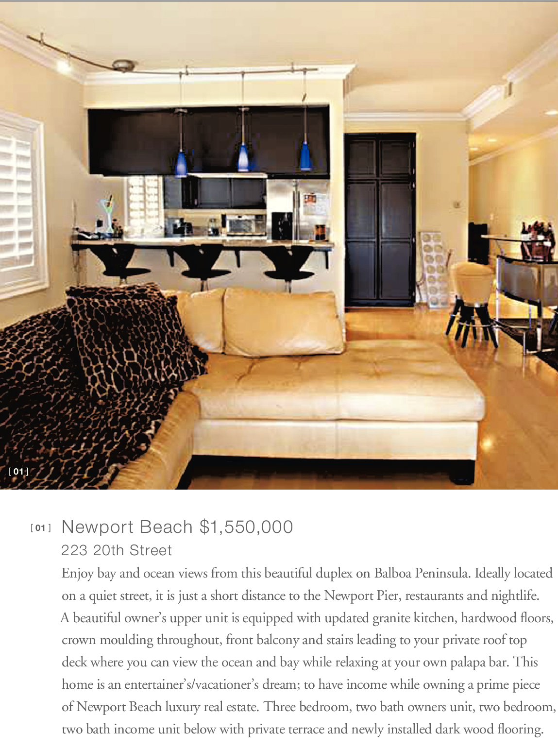 [ 01 ] [ 01 ] Newport Beach $1,550,000 223 20th Street Enjoy bay and ocean views from this beautiful duplex on Balboa Peninsula. Ideally located on a quiet street, it is just a short distance to the Newport Pier, restaurants and nightlife. A beautiful owner’s upper unit is equipped with updated granite kitchen, hardwood floors, crown moulding throughout, front balcony and stairs leading to your private roof top deck where you can view the ocean and bay while relaxing at your own palapa bar. This home is an entertainer’s/vacationer’s dream; to have income while owning a prime piece of Newport Beach luxury real estate. Three bedroom, two bath owners unit, two bedroom, two bath income unit below with private terrace and newly installed dark wood flooring. See also
