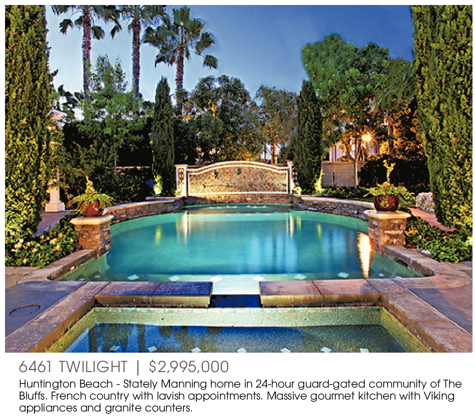 6461 TWILIGHT | $2,995,000 Huntington Beach - Stately Manning home in 24-hour guard-gated community of The Bluffs. French country with lavish appointments. Massive gourmet kitchen with Viking appliances and granite counters.