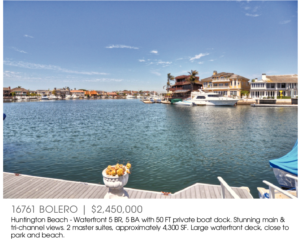 16761 BOLERO | $2,450,000 Huntington Beach - Waterfront 5 BR, 5 BA with 50 FT private boat dock. Stunning main & tri-channel views. 2 master suites, approximately 4,300 SF. Large waterfront deck, close to park and beach.
