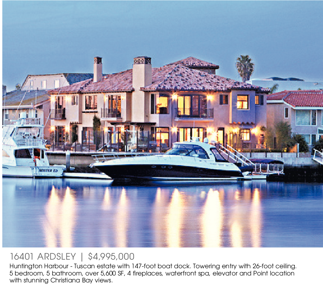 16401 ARDSLEY | $4,995,000 Huntington Harbour - Tuscan estate with 147-foot boat dock. Towering entry with 26-foot ceiling. 5 bedroom, 5 bathroom, over 5,600 SF, 4 fireplaces, waterfront spa, elevator and Point location with stunning Christiana Bay views.