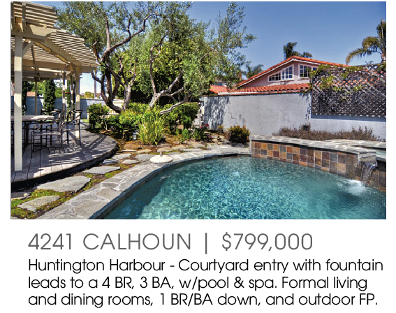 4241 CALHOUN | $799,000 Huntington Harbour - Courtyard entry with fountain leads to a4BR,3BA,w/pool & spa. Formal living and dining rooms, 1 BR/BA down, and outdoor FP.