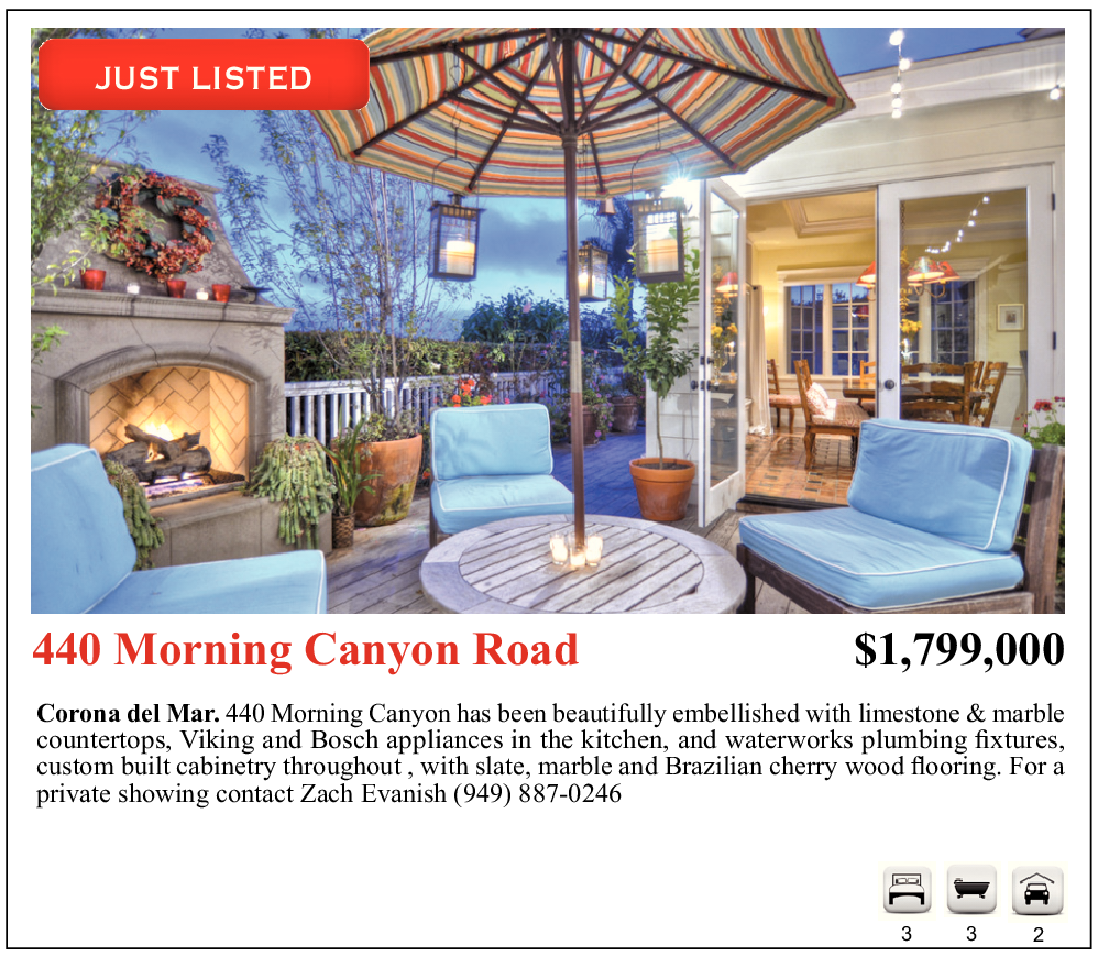 JUST LISTED 440 Morning Canyon Road $1,799,000 Corona del Mar. 440 Morning Canyon has been beautifully embellished with limestone & marble countertops, Viking and Bosch appliances in the kitchen, and waterworks plumbing fixtures, custom built cabinetry throughout , with slate, marble and Brazilian cherry wood flooring. For a private showing contact Zach Evanish (949) 887-0246 3 3 2 See also