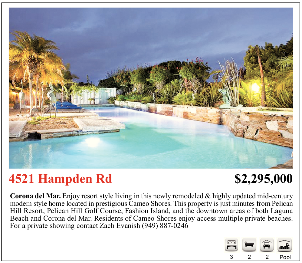 Corona del Mar. Enjoy resort style living in this newly remodeled & highly updated mid-century modern style home located in prestigious Cameo Shores. This property is just minutes from Pelican Hill Resort, Pelican Hill Golf Course, Fashion Island, and the downtown areas of both Laguna Beach and Corona del Mar. Residents of Cameo Shores enjoy access multiple private beaches. For a private showing contact Zach Evanish (949) 887-0246