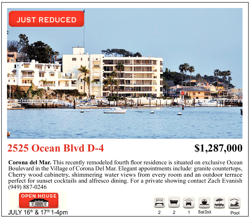 JUST REDUCED 2525 Ocean Blvd D-4 $1,287,000 Corona del Mar. This recently remodeled fourth floor residence is situated on exclusive Ocean Boulevard in the Village of Corona Del Mar. Elegant appointments include: granite countertops, Cherry wood cabinetry, shimmering water views from every room and an outdoor terrace perfect for sunset cocktails and alfresco dining. For a private showing contact Zach Evanish (949) 887-0246 JULY 16 th & 17 th 1-4pm 2 2 1 Boat Dock Pool