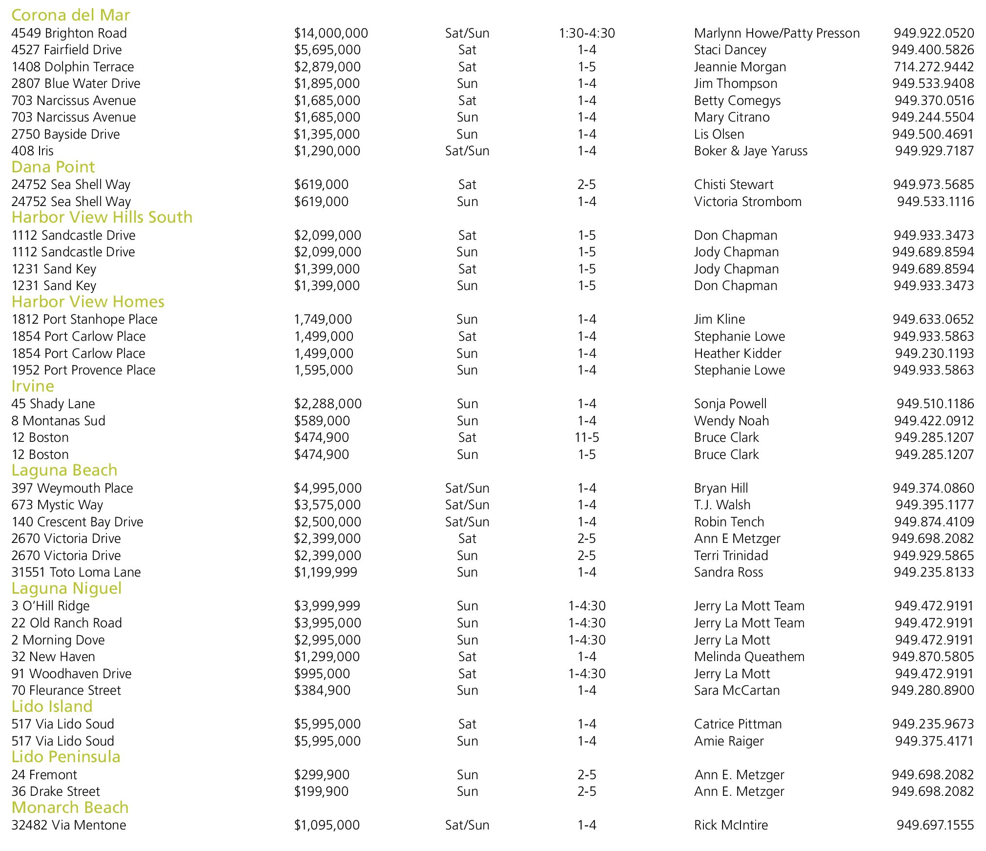 Corona del Mar 4549 Brighton Road $14,000,000 Sat/Sun 1:30-4:30 Marlynn Howe/Patty Presson 949.922.0520 4527 Fairfield Drive $5,695,000 Sat 1-4 Staci Dancey 949.400.5826 1408 Dolphin Terrace $2,879,000 Sat 1-5 Jeannie Morgan 714.272.9442 2807 Blue Water Drive $1,895,000 Sun 1-4 Jim Thompson 949.533.9408 703 Narcissus Avenue $1,685,000 Sat 1-4 Betty Comegys 949.370.0516 703 Narcissus Avenue $1,685,000 Sun 1-4 Mary Citrano 949.244.5504 2750 Bayside Drive $1,395,000 Sun 1-4 Lis Olsen 949.500.4691 408 Iris $1,290,000 Sat/Sun 1-4 Boker & Jaye Yaruss 949.929.7187 Dana Point 24752 Sea Shell Way $619,000 Sat 2-5 Chisti Stewart 949.973.5685 24752 Sea Shell Way $619,000 Sun 1-4 Victoria Strombom 949.533.1116 Harbor View Hills South 1112 Sandcastle Drive $2,099,000 Sat 1-5 Don Chapman 949.933.3473 1112 Sandcastle Drive $2,099,000 Sun 1-5 Jody Chapman 949.689.8594 1231 Sand Key $1,399,000 Sat 1-5 Jody Chapman 949.689.8594 1231 Sand Key $1,399,000 Sun 1-5 Don Chapman 949.933.3473 Harbor View Homes 1812 Port Stanhope Place 1,749,000 Sun 1-4 Jim Kline 949.633.0652 1854 Port Carlow Place 1,499,000 Sat 1-4 Stephanie Lowe 949.933.5863 1854 Port Carlow Place 1,499,000 Sun 1-4 Heather Kidder 949.230.1193 1952 Port Provence Place 1,595,000 Sun 1-4 Stephanie Lowe 949.933.5863 Irvine 45 Shady Lane $2,288,000 Sun 1-4 Sonja Powell 949.510.1186 8 Montanas Sud $589,000 Sun 1-4 Wendy Noah 949.422.0912 12 Boston $474,900 Sat 11-5 Bruce Clark 949.285.1207 12 Boston $474,900 Sun 1-5 Bruce Clark 949.285.1207 Laguna Beach 397 Weymouth Place $4,995,000 Sat/Sun 1-4 Bryan Hill 949.374.0860 673 Mystic Way $3,575,000 Sat/Sun 1-4 T.J. Walsh 949.395.1177 140 Crescent Bay Drive $2,500,000 Sat/Sun 1-4 Robin Tench 949.874.4109 2670 Victoria Drive $2,399,000 Sat 2-5 Ann E Metzger 949.698.2082 2670 Victoria Drive $2,399,000 Sun 2-5 Terri Trinidad 949.929.5865 31551 Toto Loma Lane $1,199,999 Sun 1-4 Sandra Ross 949.235.8133 Laguna Niguel 3 O’Hill Ridge $3,999,999 Sun 1-4:30 Jerry La Mott Team 949.472.9191 22 Old Ranch Road $3,995,000 Sun 1-4:30 Jerry La Mott Team 949.472.9191 2 Morning Dove $2,995,000 Sun 1-4:30 Jerry La Mott 949.472.9191 32 New Haven $1,299,000 Sat 1-4 Melinda Queathem 949.870.5805 91 Woodhaven Drive $995,000 Sat 1-4:30 Jerry La Mott 949.472.9191 70 Fleurance Street $384,900 Sun 1-4 Sara McCartan 949.280.8900 Lido Island 517 Via Lido Soud $5,995,000 Sat 1-4 Catrice Pittman 949.235.9673 517 Via Lido Soud $5,995,000 Sun 1-4 Amie Raiger 949.375.4171 Lido Peninsula 24 Fremont $299,900 Sun 2-5 Ann E. Metzger 949.698.2082 36 Drake Street $199,900 Sun 2-5 Ann E. Metzger 949.698.2082 Monarch Beach 32482 Via Mentone $1,095,000 Sat/Sun 1-4 Rick McIntire 949.697.1555