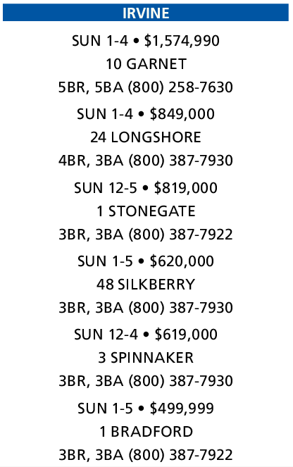 IRVINE SUN 1-4 • $1,574,990 10 GARNET 5BR, 5BA (800) 258-7630 SUN 1-4 • $849,000 24 LONGSHORE 4BR, 3BA (800) 387-7930 SUN 12-5 • $819,000 1 STONEGATE 3BR, 3BA (800) 387-7922 SUN 1-5 • $620,000 48 SILKBERRY 3BR, 3BA (800) 387-7930 SUN 12-4 • $619,000 3 SPINNAKER 3BR, 3BA (800) 387-7930 SUN 1-5 • $499,999 1 BRADFORD 3BR, 3BA (800) 387-7922