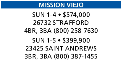 MISSION VIEJO SUN 1-4 • $574,000 26732 STRAFFORD 4BR, 3BA (800) 258-7630 SUN 1-5 • $399,900 23425 SAINT ANDREWS 3BR, 3BA (800) 387-1455