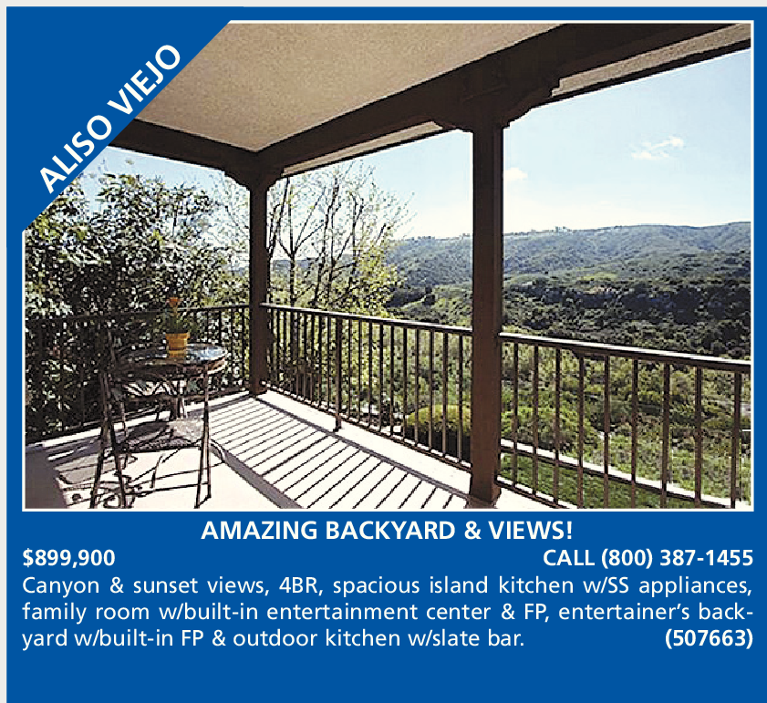 AMAZING BACKYARD & VIEWS! $899,900 CALL (800) 387-1455 Canyon & sunset views, 4BR, spacious island kitchen w/SS appliances, family room w/built-in entertainment center & FP, entertainer’s backyard w/built-in FP & outdoor kitchen w/slate bar. (507663)