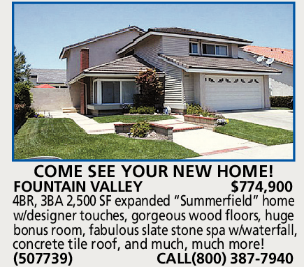 COME SEE YOUR NEW HOME! FOUNTAIN VALLEY $774,900 4BR, 3BA 2,500 SF expanded “Summerfield” home w/designer touches, gorgeous wood floors, huge bonus room, fabulous slate stone spa w/waterfall, concrete tile roof, and much, much more! (507739) CALL(800) 387-7940