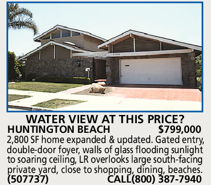 HUNTINGTON BEACH $799,000 2,800 SF home expanded & updated. Gated entry, double-door foyer, walls of glass flooding sunlight to soaring ceiling, LR overlooks large south-facing private yard, close to shopping, dining, beaches. (507737) CALL(800) 387-7940