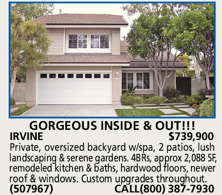 GORGEOUS INSIDE & OUT!!! IRVINE $739,900 Private, oversized backyard w/spa, 2 patios, lush landscaping & serene gardens. 4BRs, approx 2,088 SF, remodeled kitchen & baths, hardwood floors, newer roof & windows. Custom upgrades throughout. (507967) CALL(800) 387-7930