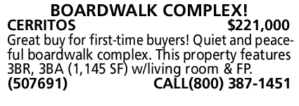 CERRITOS $221,000 Great buy for first-time buyers! Quiet and peaceful boardwalk complex. This property features 3BR, 3BA (1,145 SF) w/living room & FP. (507691) CALL(800) 387-1451