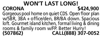 CORONA $424,900 Gorgeous pool home on quiet CDS. Open floor plan w/5BR, 3BA + office/den, BR/BA down. Spacious loft. Gourmet island kitchen, formal living & dining rooms & family room w/FP. Better Hurry! (507862) CALL(888) 307-0052