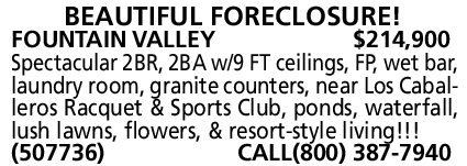 BEAUTIFUL FORECLOSURE! FOUNTAIN VALLEY $214,900 Spectacular 2BR, 2BA w/9 FT ceilings, FP, wet bar, laundry room, granite counters, near Los Caballeros Racquet & Sports Club, ponds, waterfall, lush lawns, flowers, & resort-style living!!! (507736) CALL(800) 387-7940
