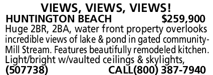 VIEWS, VIEWS, VIEWS! HUNTINGTON BEACH $259,900 Huge 2BR, 2BA, water front property overlooks incredible views of lake & pond in gated community- Mill Stream. Features beautifully remodeled kitchen. Light/bright w/vaulted ceilings & skylights, (507738) CALL(800) 387-7940