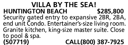HUNTINGTON BEACH $285,800 Security gated entry to expansive 2BR, 2BA, end unit Condo. Entertainer’s-size living room. Granite kitchen, king-size master suite. Close to pool & spa. (507719) CALL(800) 387-7925