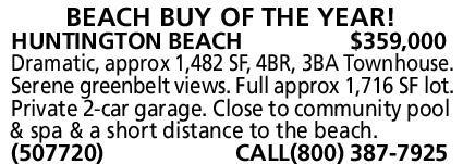 BEACH BUY OF THE YEAR! HUNTINGTON BEACH $359,000 Dramatic, approx 1,482 SF, 4BR, 3BA Townhouse. Serene greenbelt views. Full approx 1,716 SF lot. Private 2-car garage. Close to community pool & spa & a short distance to the beach. (507720) CALL(800) 387-7925