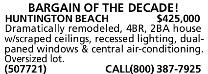 HUNTINGTON BEACH $425,000 Dramatically remodeled, 4BR, 2BA house w/scraped ceilings, recessed lighting, dualpaned windows & central air-conditioning.