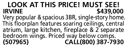 LOOK AT THIS PRICE! MUST SEE! IRVINE $439,000 Very popular & spacious 3BR, single-story home. This floorplan features soaring ceilings, central atrium, large kitchen, fireplace & 2 separate bedroom wings. Priced way below comps. (507965) CALL(800) 387-7930