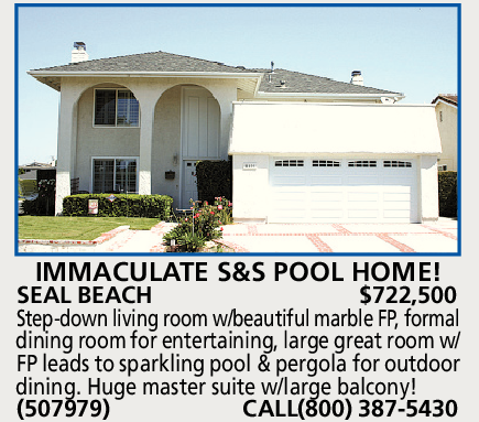 IMMACULATE S&S POOL HOME! SEAL BEACH $722,500 Step-down living room w/beautiful marble FP, formal dining room for entertaining, large great room w/ FP leads to sparkling pool & pergola for outdoor dining. Huge master suite w/large balcony! (507979) CALL(800) 387-5430