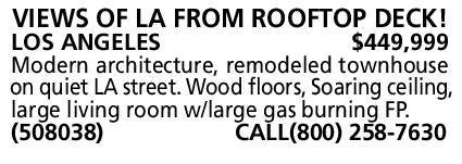 VIEWS OF LA FROM ROOFTOP DECK! LOS ANGELES $449,999 Modern architecture, remodeled townhouse on quiet LA street. Wood floors, Soaring ceiling, large living room w/large gas burning FP. (508038) CALL(800) 258-7630