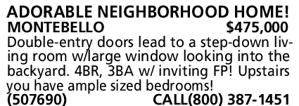 ADORABLE NEIGHBORHOOD HOME! MONTEBELLO $475,000 Double-entry doors lead to a step-down living room w/large window looking into the backyard. 4BR, 3BA w/ inviting FP! Upstairs you have ample sized bedrooms! (507690) CALL(800) 387-1451