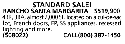 RANCHO SANTA MARGARITA $519,900 4BR, 3BA, almost 2,000 SF, located on a cul-de-sac lot, French doors, FP, SS appliances, recessed lighting and more. (508022) CALL(800) 387-1450