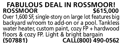 FABULOUS DEAL IN ROSSMOOR! ROSSMOOR $615,000 Over 1,600 SF, single-story on large lot features big backyard w/room to add-on or a pool. Tankless water heater, custom paint, cozy FP + hardwood floors & cozy FP. Light & bright bargain (507881) CALL(800) 490-0562