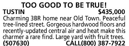 TUSTIN $435,000 Charming 3BR home near Old Town. Peaceful tree-lined street. Gorgeous hardwood floors and recently-updated central air and heat make this charmer a rare find. Large yard with fruit trees.