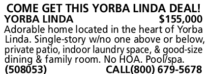 COME GET THIS YORBA LINDA DEAL! YORBA LINDA $155,000 Adorable home located in the heart of Yorba Linda. Single-story w/no one above or below, private patio, indoor laundry space, & good-size dining & family room. No HOA. Pool/spa. (508053) CALL(800) 679-5678