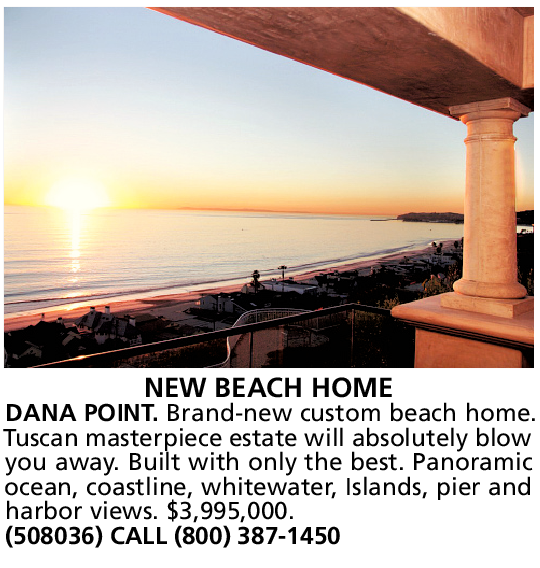 NEW BEACH HOME DANA POINT. Brand-new custom beach home. Tuscan masterpiece estate will absolutely blow you away. Built with only the best. Panoramic ocean, coastline, whitewater, Islands, pier and harbor views. $3,995,000. (508036) CALL (800) 387-1450