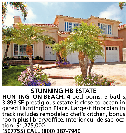 STUNNING HB ESTATE HUNTINGTON BEACH. 4 bedrooms, 5 baths, 3,898 SF prestigious estate is close to ocean in gated Huntington Place. Largest floorplan in track includes remodeled chef’s kitchen, bonus room plus library/office. Interior cul-de-sac location. $1,275,000. (507755) CALL (800) 387-7940