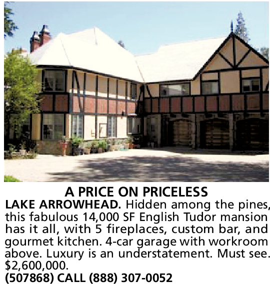 A PRICE ON PRICELESS LAKE ARROWHEAD. Hidden among the pines, this fabulous 14,000 SF English Tudor mansion has it all, with 5 fireplaces, custom bar, and gourmet kitchen. 4-car garage with workroom above. Luxury is an understatement. Must see. $2,600,000. (507868) CALL (888) 307-0052