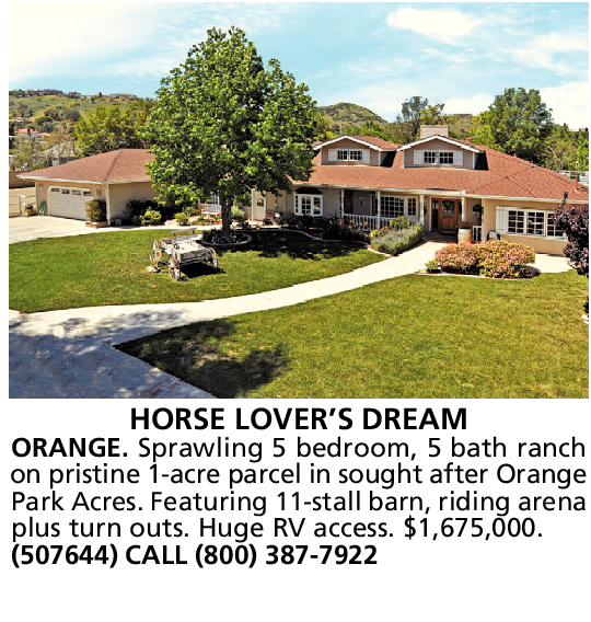 HORSE LOVER’S DREAM ORANGE. Sprawling 5 bedroom, 5 bath ranch on pristine 1-acre parcel in sought after Orange Park Acres. Featuring 11-stall barn, riding arena plus turn outs. Huge RV access. $1,675,000. (507644) CALL (800) 387-7922