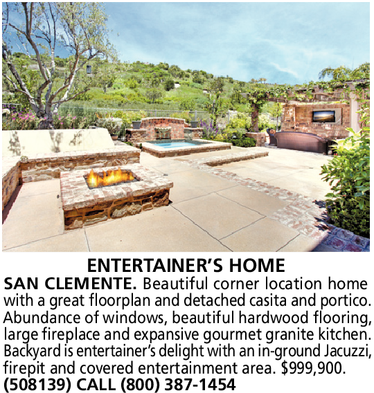 ENTERTAINER’S HOME SAN CLEMENTE. Beautiful corner location home with a great floorplan and detached casita and portico. Abundance of windows, beautiful hardwood flooring, large fireplace and expansive gourmet granite kitchen. Backyard is entertainer’s delight with an in-ground Jacuzzi, firepit and covered entertainment area. $999,900. (508139) CALL (800) 387-1454