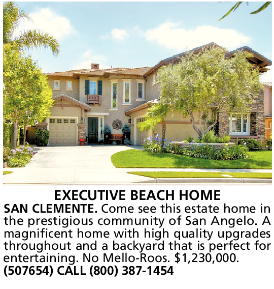 EXECUTIVE BEACH HOME SAN CLEMENTE. Come see this estate home in the prestigious community of San Angelo. A magnificent home with high quality upgrades throughout and a backyard that is perfect for entertaining. No Mello-Roos. $1,230,000. (507654) CALL (800) 387-1454