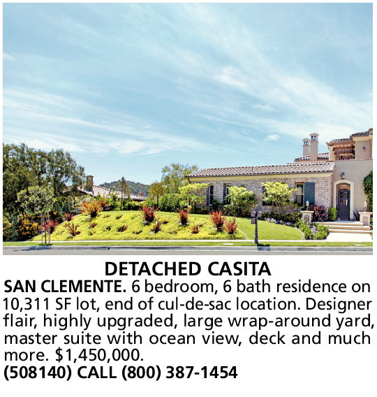 DETACHED CASITA SAN CLEMENTE. 6 bedroom, 6 bath residence on 10,311 SF lot, end of cul-de-sac location. Designer flair, highly upgraded, large wrap-around yard, master suite with ocean view, deck and much more. $1,450,000. (508140) CALL (800) 387-1454