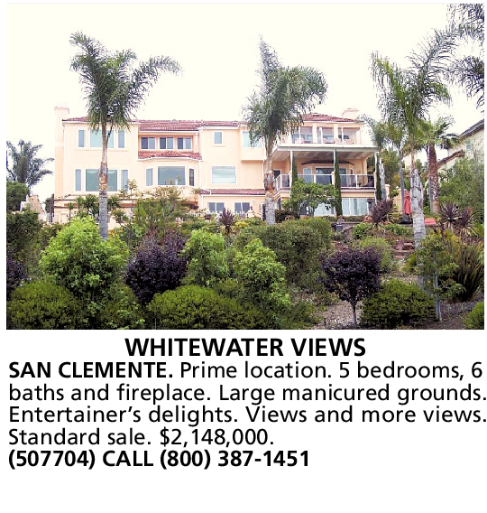 WHITEWATER VIEWS SAN CLEMENTE. Prime location. 5 bedrooms, 6 baths and fireplace. Large manicured grounds. Entertainer’s delights. Views and more views. Standard sale. $2,148,000. (507704) CALL (800) 387-1451