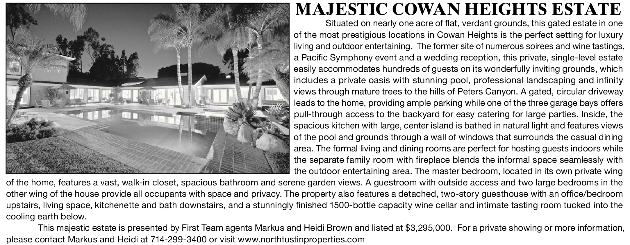 MAJESTIC COWAN HEIGHTS ESTATE Situated on nearly one acre of flat, verdant grounds, this gated estate in one of the most prestigious locations in Cowan Heights is the perfect setting for luxury living and outdoor entertaining. The former site of numerous soirees and wine tastings, a Pacific Symphony event and a wedding reception, this private, single-level estate easily accommodates hundreds of guests on its wonderfully inviting grounds, which includes a private oasis with stunning pool, professional landscaping and infinity views through mature trees to the hills of Peters Canyon. A gated, circular driveway leads to the home, providing ample parking while one of the three garage bays offers pull-through access to the backyard for easy catering for large parties. Inside, the spacious kitchen with large, center island is bathed in natural light and features views of the pool and grounds through a wall of windows that surrounds the casual dining area. The formal living and dining rooms are perfect for hosting guests indoors while the separate family room with fireplace blends the informal space seamlessly with the outdoor entertaining area. The master bedroom, located in its own private wing of the home, features a vast, walk-in closet, spacious bathroom and serene garden views. A guestroom with outside access and two large bedrooms in the other wing of the house provide all occupants with space and privacy. The property also features a detached, two-story guesthouse with an office/bedroom upstairs, living space, kitchenette and bath downstairs, and a stunningly finished 1500-bottle capacity wine cellar and intimate tasting room tucked into the cooling earth below. This majestic estate is presented by First Team agents Markus and Heidi Brown and listed at $3,295,000. For a private showing or more information, please contact Markus and Heidi at 714-299-3400 or visit www.northtustinproperties.com