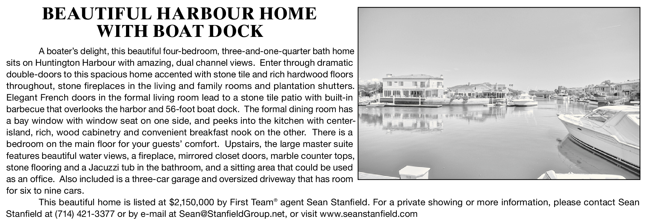BEAUTIFUL HARBOUR HOME WITH BOAT DOCK A boater’s delight, this beautiful four-bedroom, three-and-one-quarter bath home sits on Huntington Harbour with amazing, dual channel views. Enter through dramatic double-doors to this spacious home accented with stone tile and rich hardwood floors throughout, stone fireplaces in the living and family rooms and plantation shutters. Elegant French doors in the formal living room lead to a stone tile patio with built-in barbecue that overlooks the harbor and 56-foot boat dock. The formal dining room has a bay window with window seat on one side, and peeks into the kitchen with centerisland, rich, wood cabinetry and convenient breakfast nook on the other. There is a bedroom on the main floor for your guests’ comfort. Upstairs, the large master suite features beautiful water views, a fireplace, mirrored closet doors, marble counter tops, stone flooring and a Jacuzzi tub in the bathroom, and a sitting area that could be used as an office. Also included is a three-car garage and oversized driveway that has room for six to nine cars. This beautiful home is listed at $2,150,000 by First Team ® agent Sean Stanfield. For a private showing or more information, please contact Sean Stanfield at (714) 421-3377 or by e-mail at Sean@StanfieldGroup.net, or visit www.seanstanfield.com